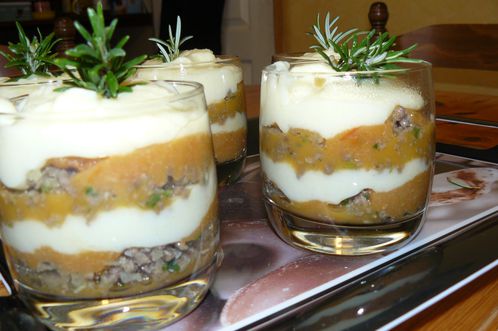 Au fond de chaque verre, mettre la viande, puis le coulis de tomates, puis la purée.Renouveler l’opération.Mettre un brin de romarin sur chaque verre.