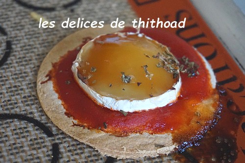 Déposer sur le fromage de chèvre une goutte de miel et des herbes.