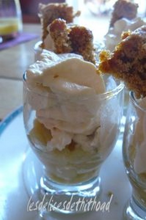 Au moment de servir, mettre les poires confites dans les verrines; ajouter la cartouche de gaz au siphon , bien secouer et répartir la mousse sur les poires.