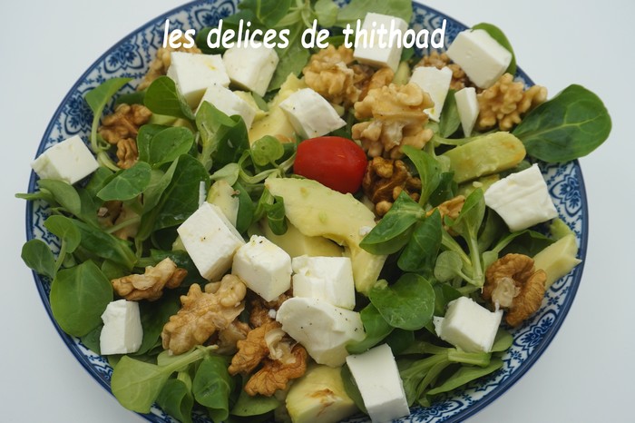 Disposer dans chaque assiette la mâche, puis les avocats, noix, feta.