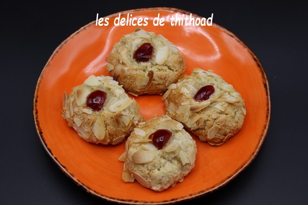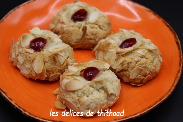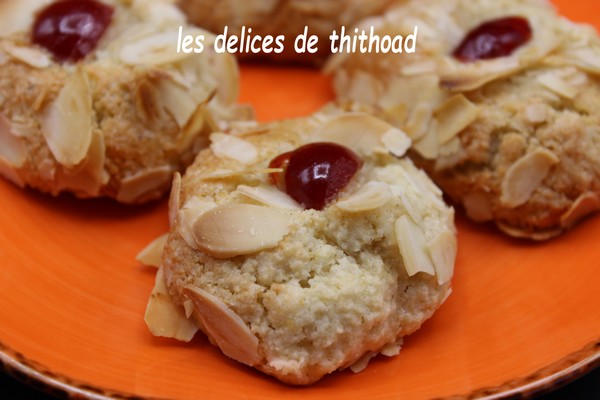Ajouter 1/4 de cerise confite sur chaque biscuit.