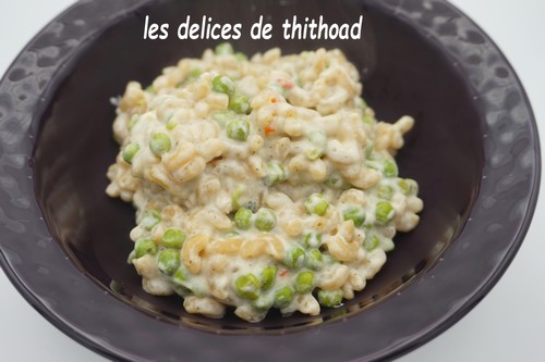 Mettre les coquillettes , le bouillon chaud et les petits pois dans une cocotte.