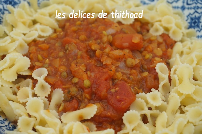 lentilles, tomates, pâtes