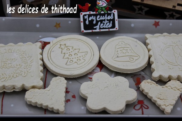 Cela m’a permis d’utiliser le rouleau à pâtisserie à motifs que j’avais reçu en cadeau , ainsi que des formes diverses pour varier l’ensemble.