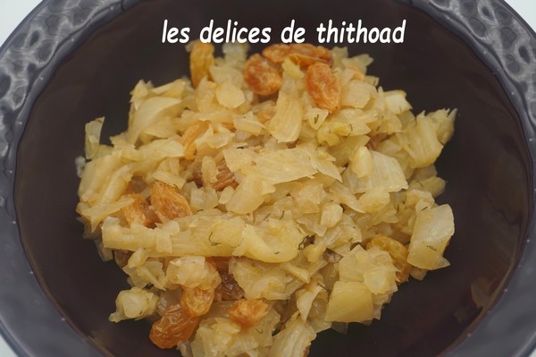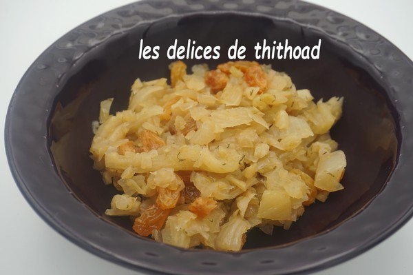 Ajouter les raisins et les graines de fenouil et poursuivre la cuisson durant 5 à 10 mn.
