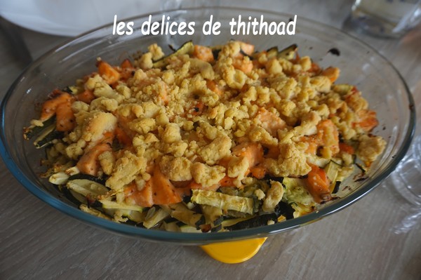 L’époque des courgettes étant revenue et la météo maussade, ce crumble a fait notre repas samedi dernier sous la pluie.