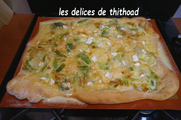 Voici une nouvelle pizza, avec les poireaux du jardin et un brie bien fait.