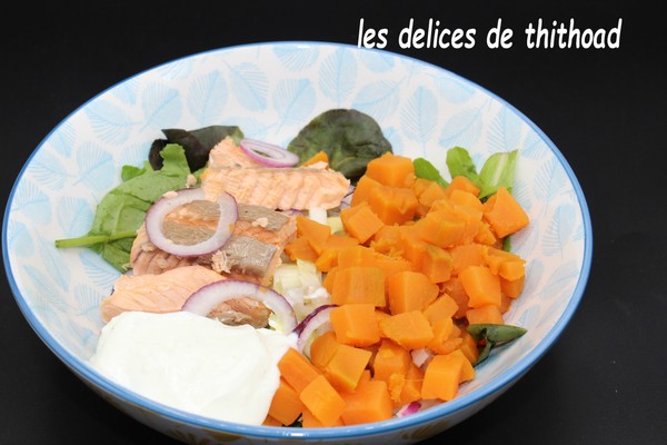 J’ai associé le saumon à la patate douce, pour réaliser une salade qui se mangera froide.